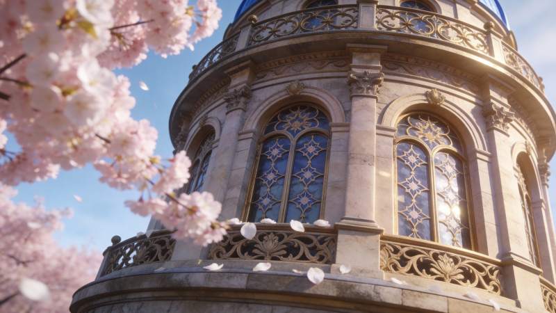 樱花映衬下的欧式建筑穹顶