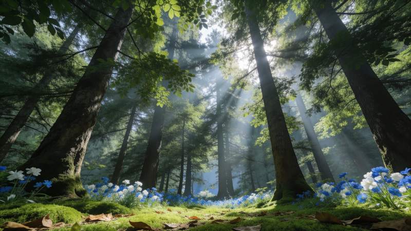 阳光穿透森林花丛