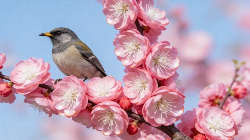 小鸟栖息樱花枝头