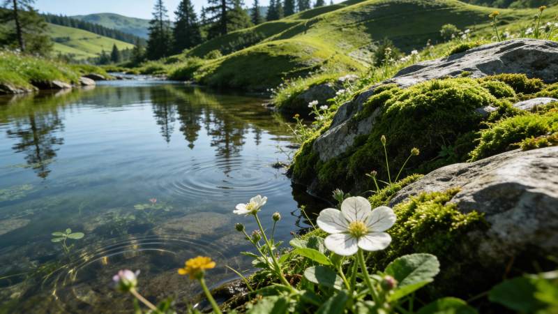 山间溪流旁的花草与青苔