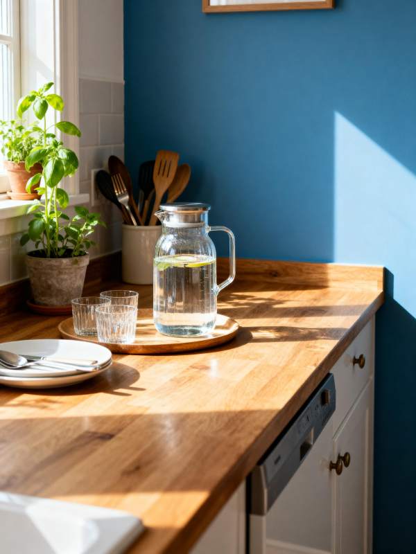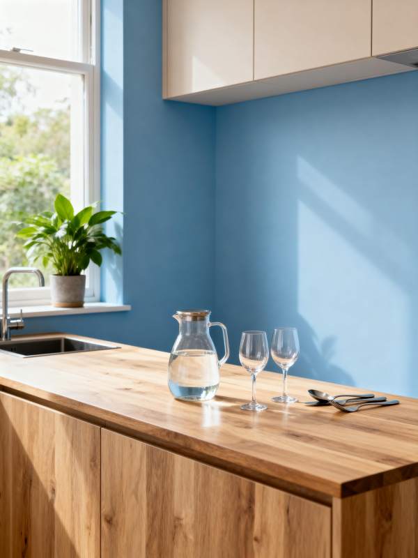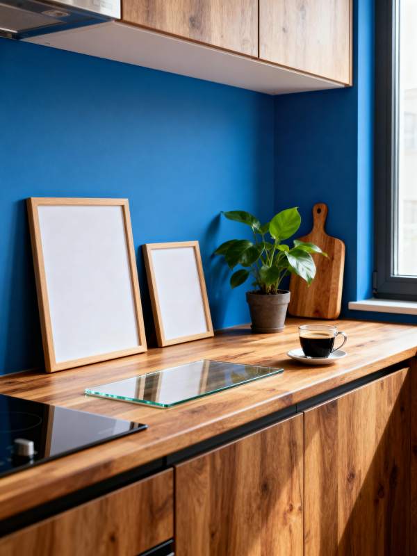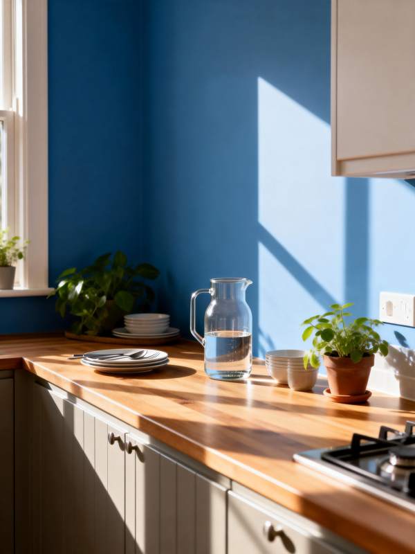 蓝墙木柜厨房一角
