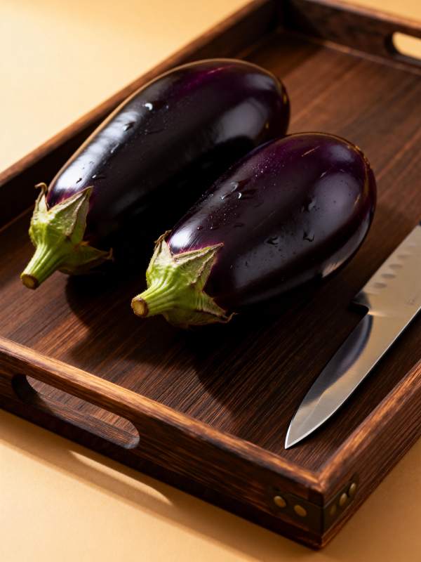 茄子与刀具静置木盘