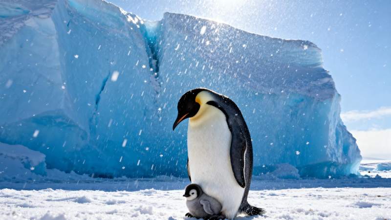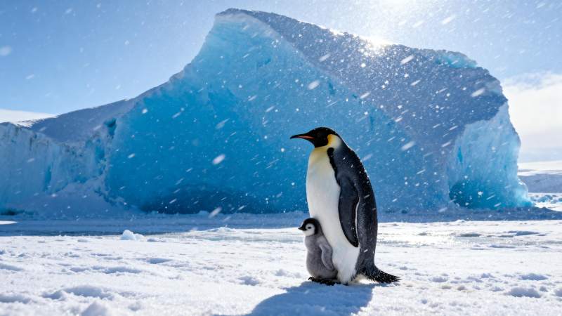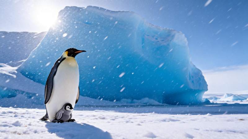 企鹅与幼崽雪中相伴