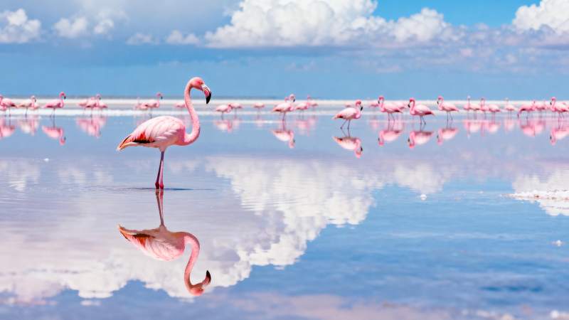 粉红火烈鸟湖畔倒影
