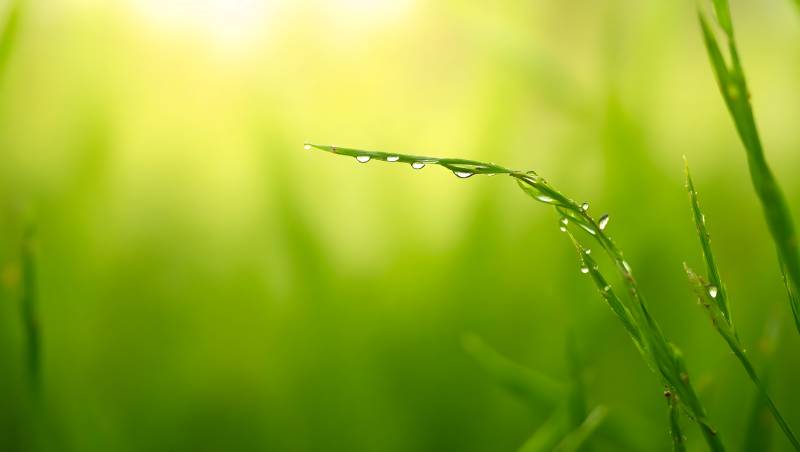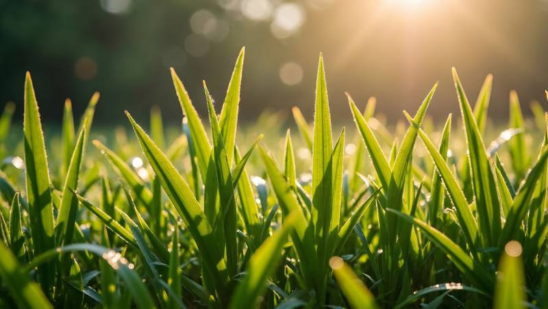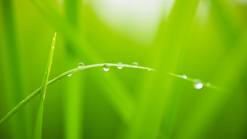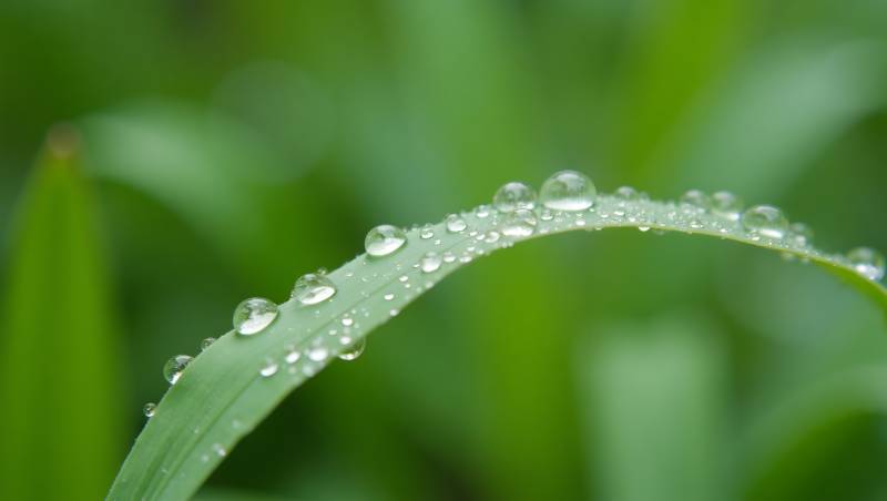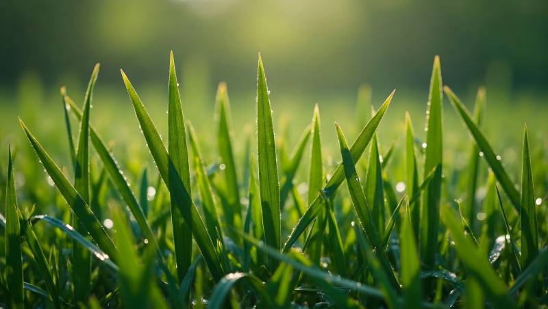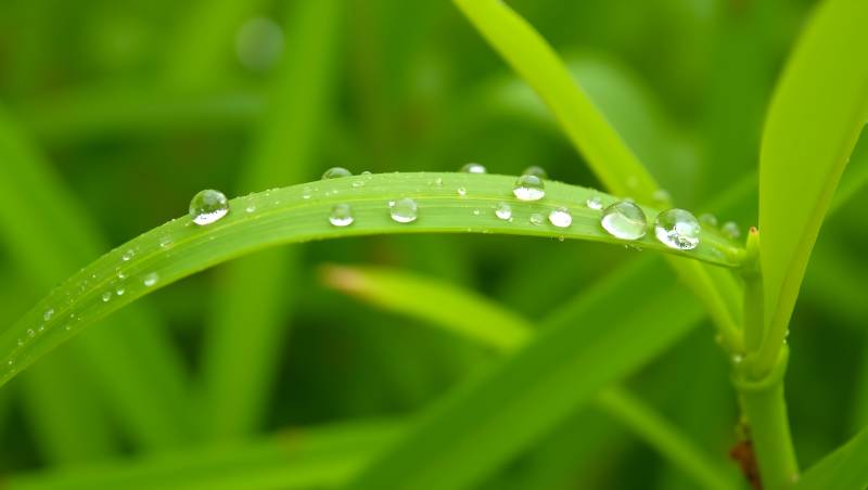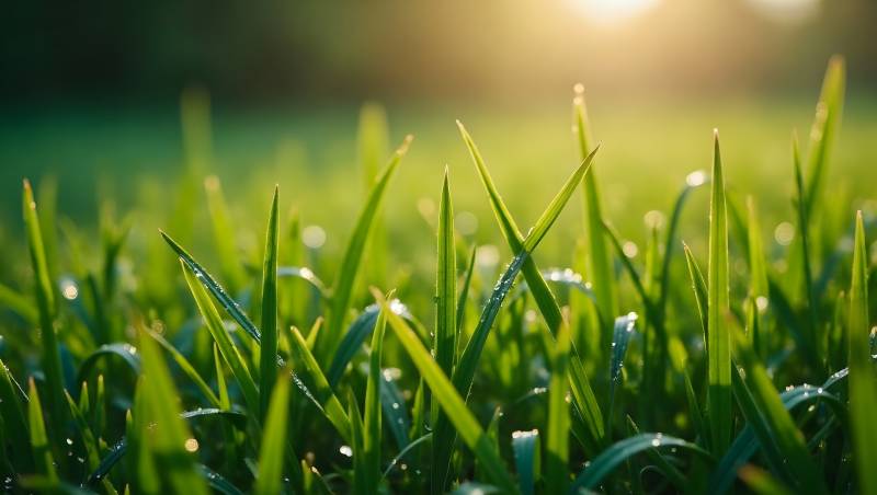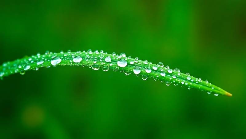清晨露珠点缀翠绿草叶