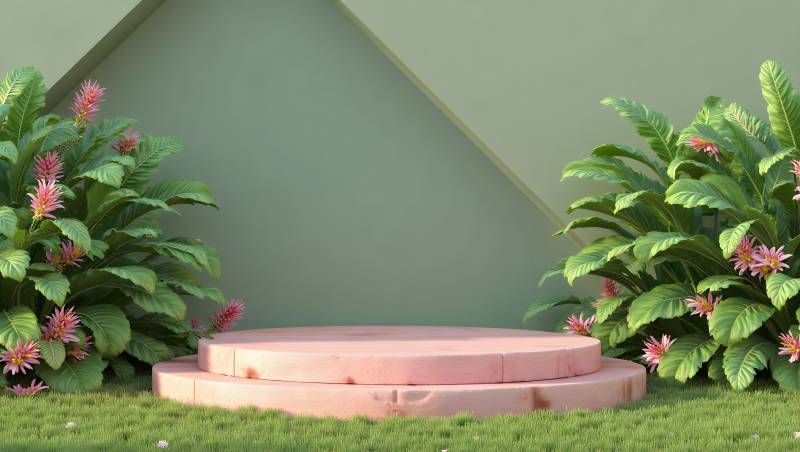 绿植环绕的粉色讲台