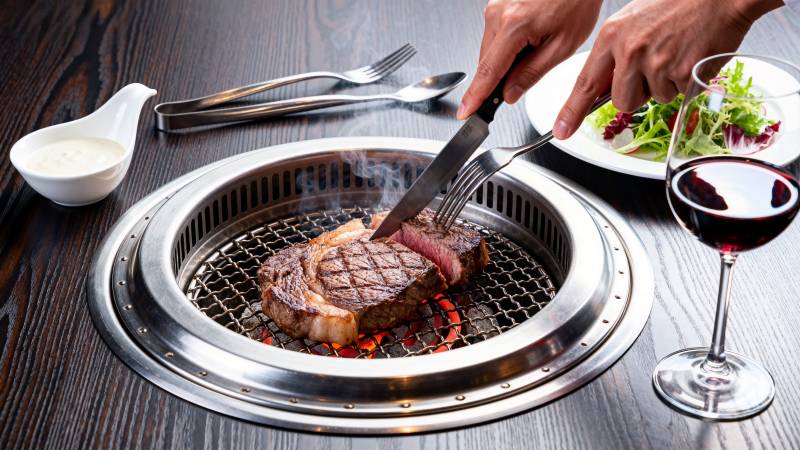 烤牛排配红酒