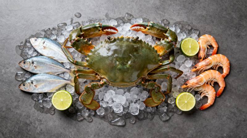 冰上鲜虾与贝壳