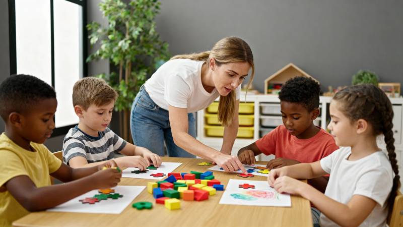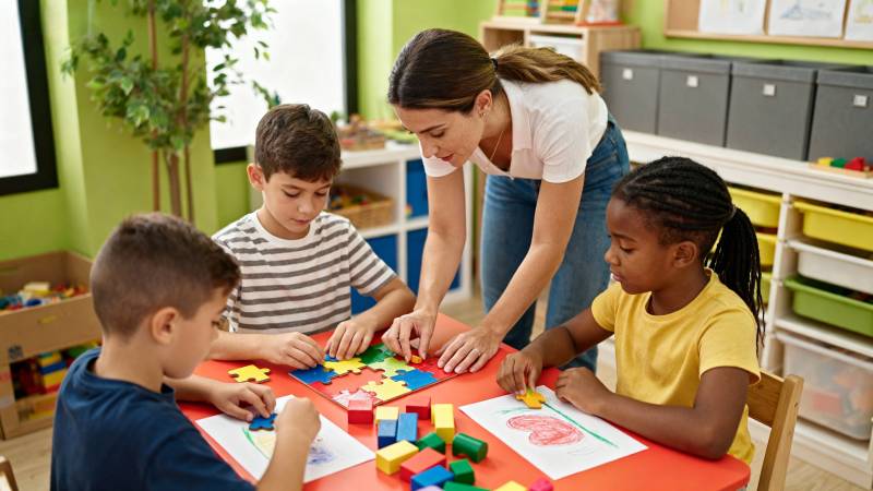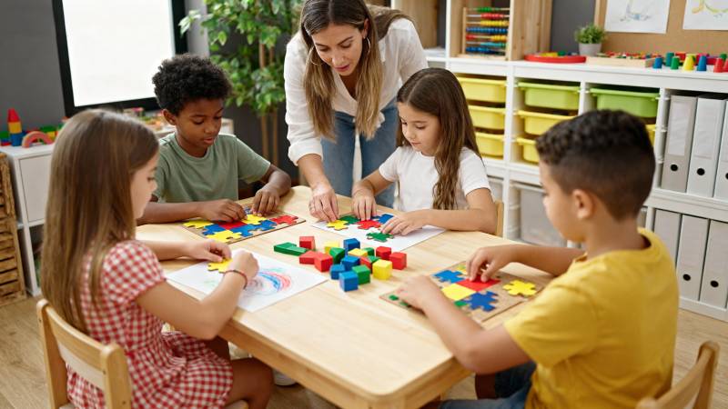 老师指导孩子拼图