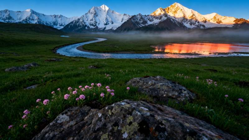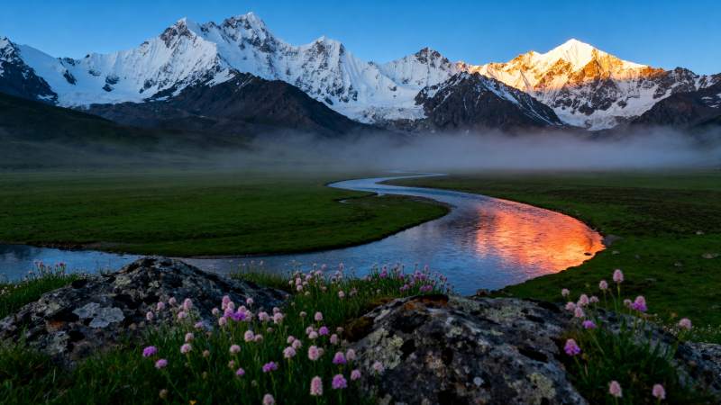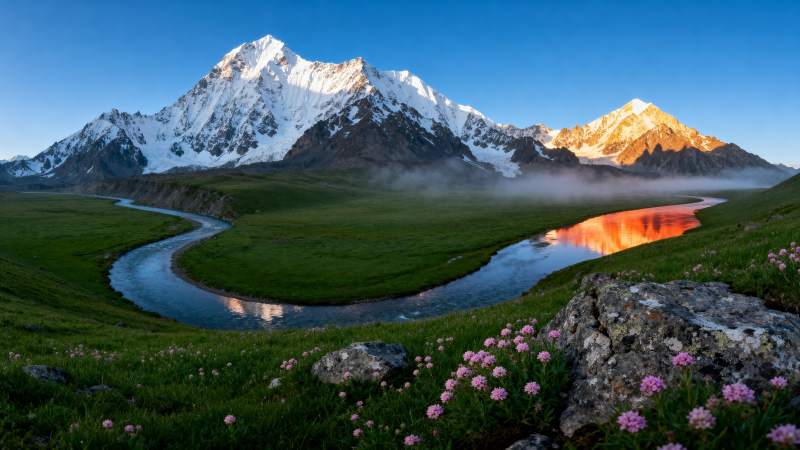 雪山映霞 溪流花海