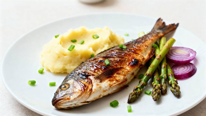烤鱼配土豆泥与芦笋