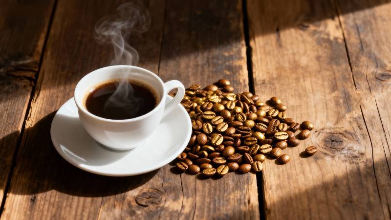 咖啡豆散落木桌