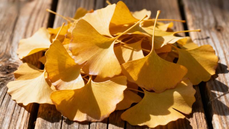 银杏叶铺木桌