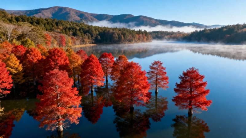 秋湖红林倒影