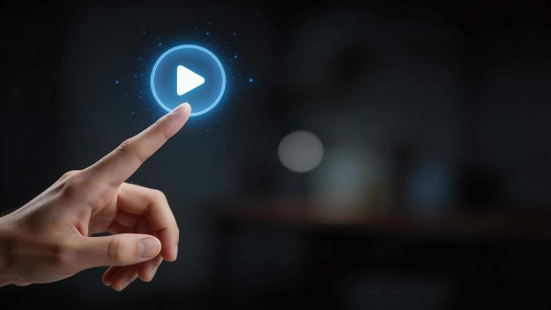 手指触碰发光蓝色播放按钮图标