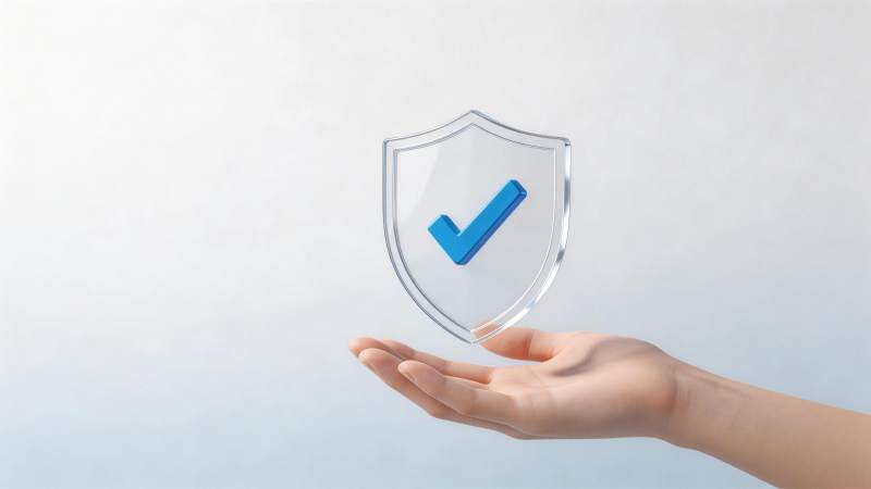 手掌托举透明盾牌内蓝色对勾图标