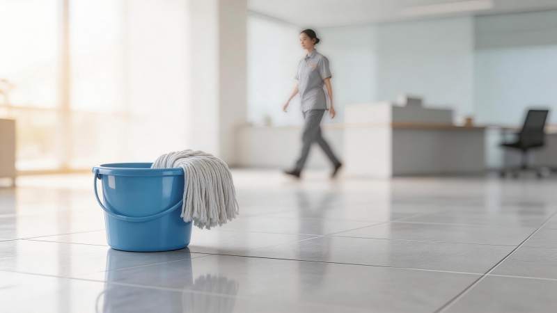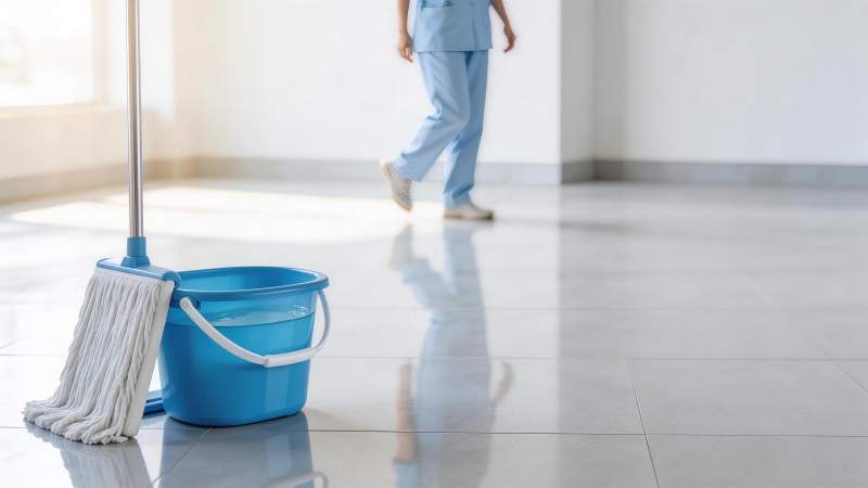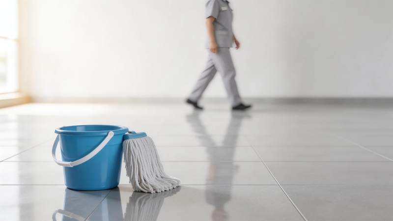 蓝色水桶与拖把置于光洁走廊地面