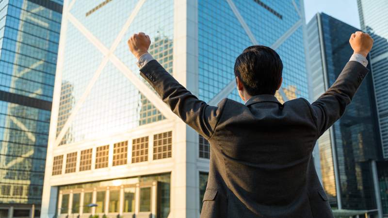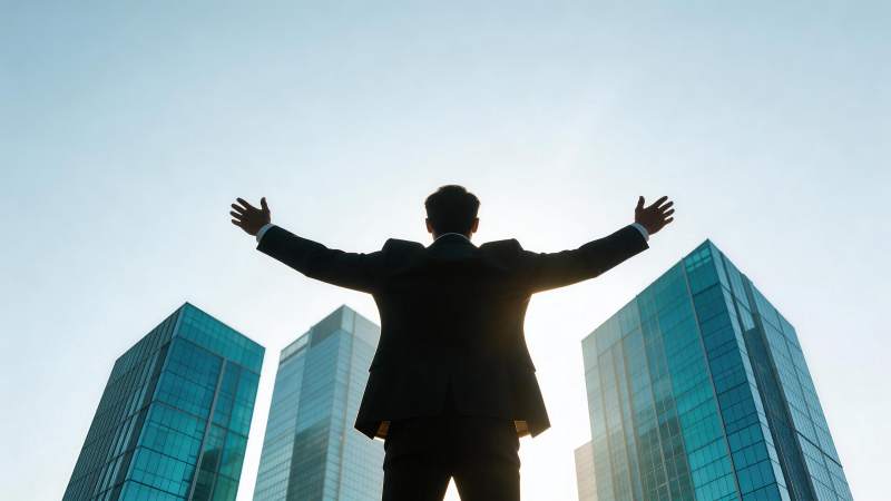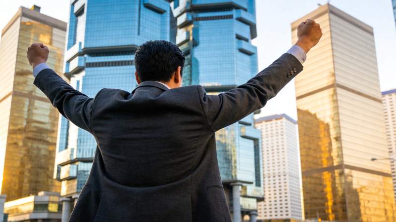 西装男子背对镜头双臂高举于摩天大楼前