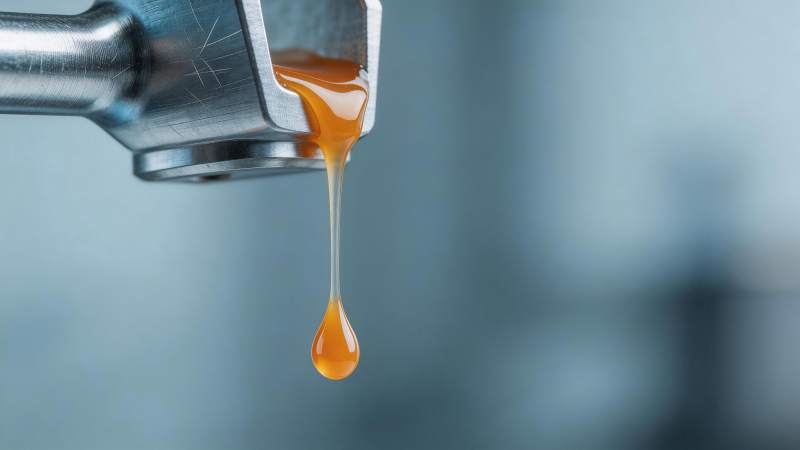 金属钳口滴落琥珀色黏稠液体特写