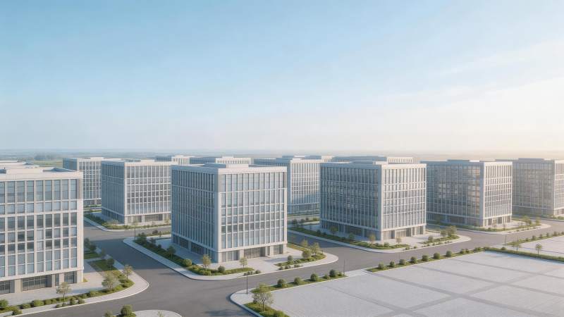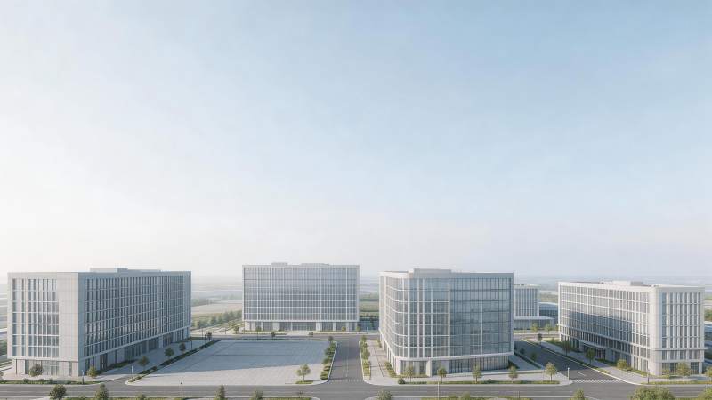 现代园区多栋玻璃幕墙办公楼群鸟瞰图