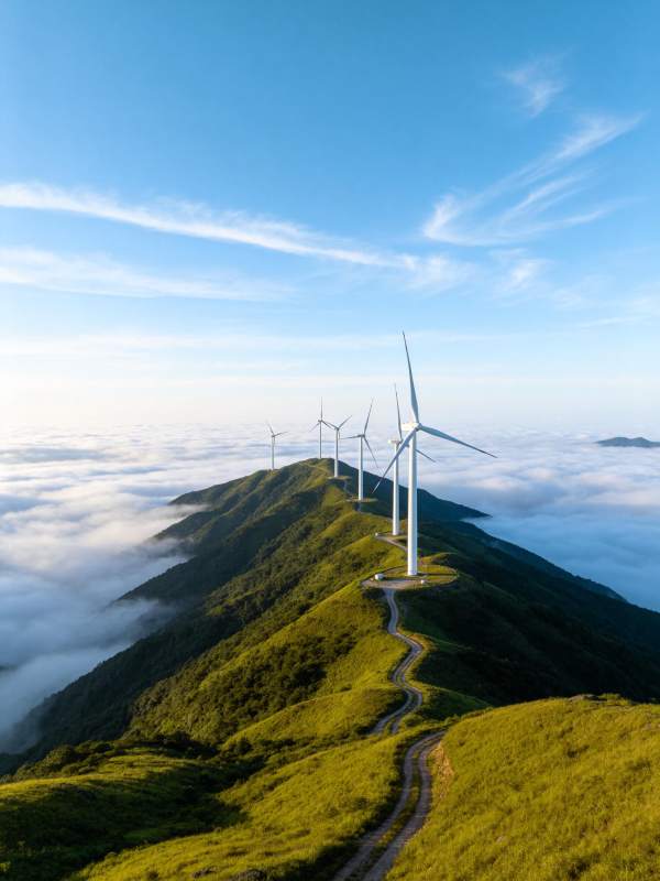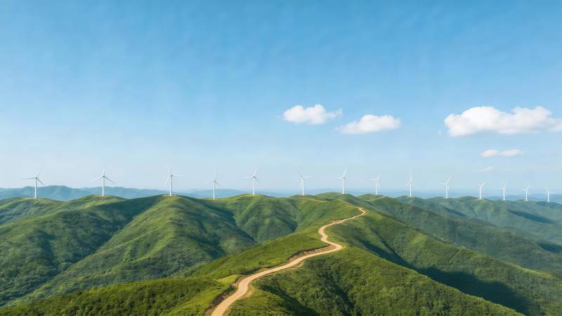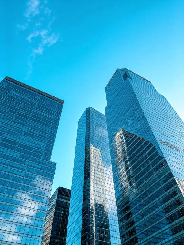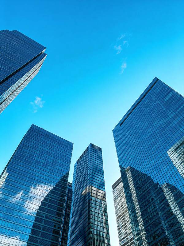 蓝天映衬下多座玻璃幕墙摩天大楼仰拍景象