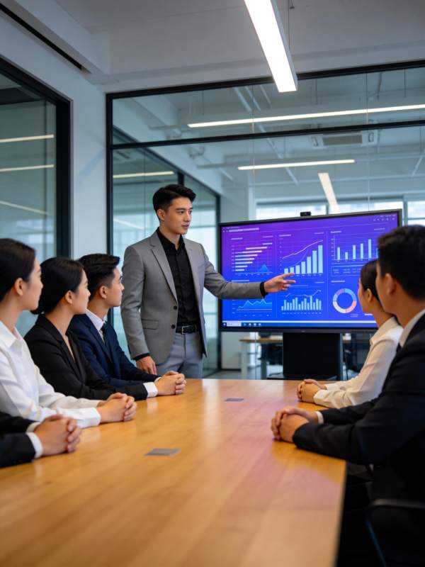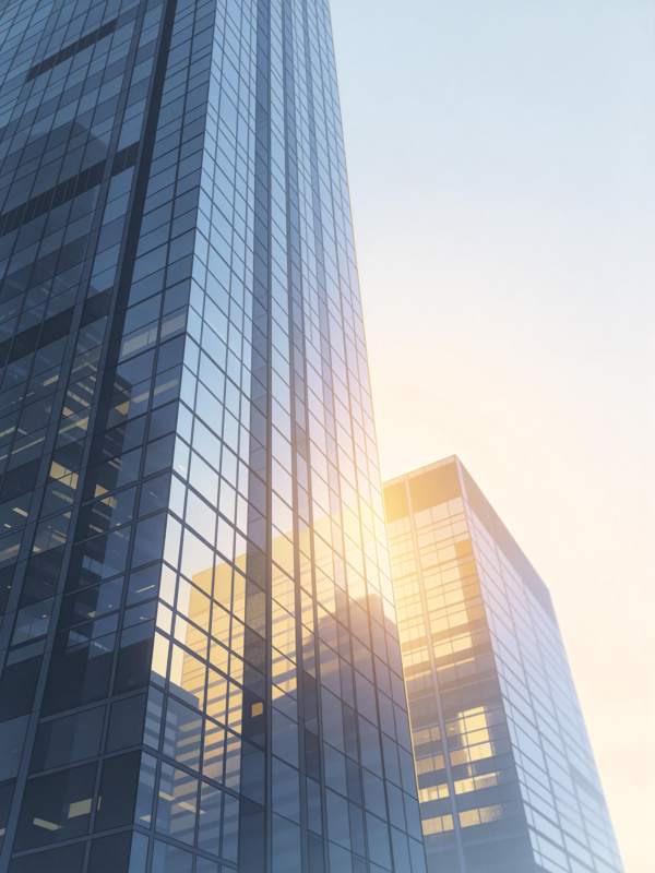 仰拍视角下的现代玻璃幕墙摩天大楼群