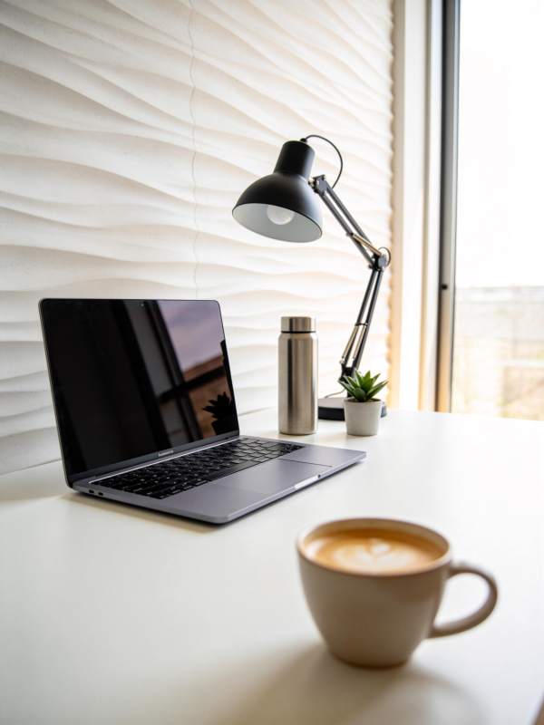 白色桌面上摆放笔记本电脑咖啡杯台灯绿植水