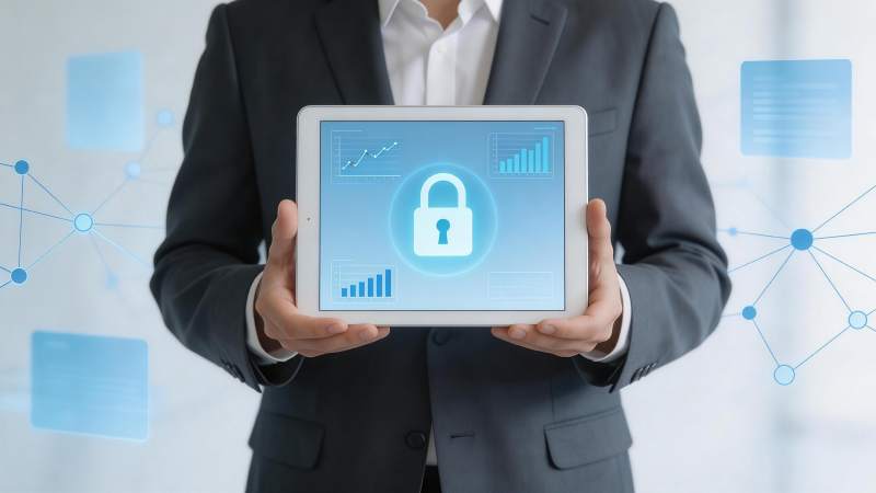 商务人士手持平板展示数据安全图标界面