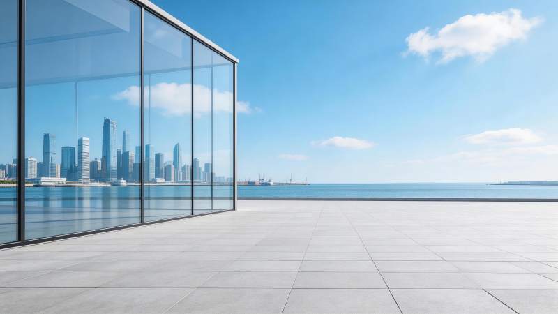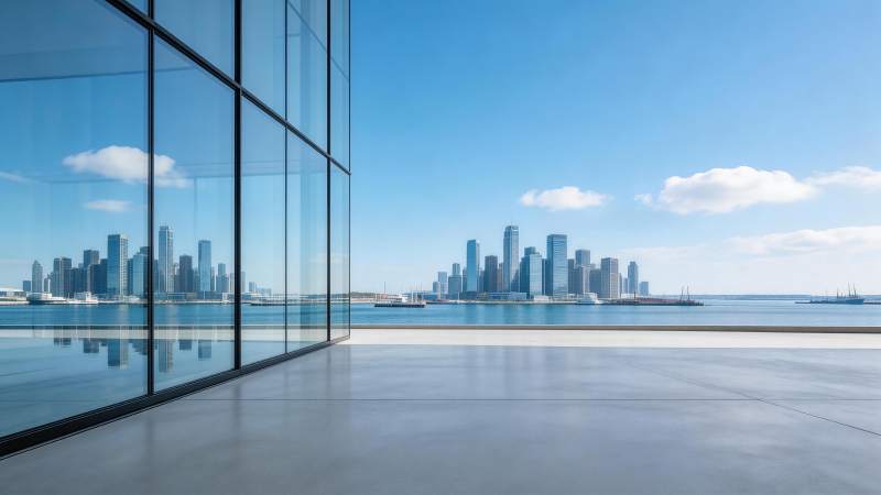 玻璃幕墙建筑前开阔海景与城市天际线倒影