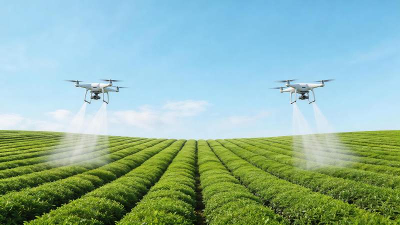 两架无人机在茶园上空喷洒作业