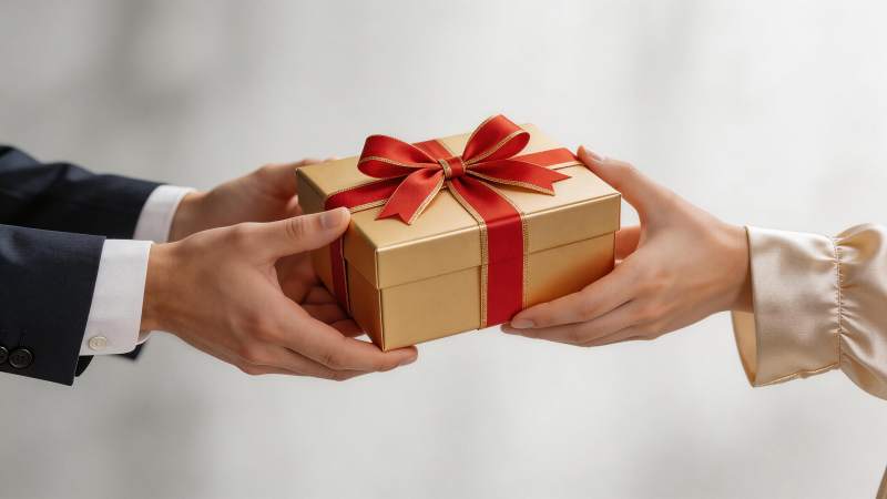 两人交接系红丝带金色礼盒的特写画面