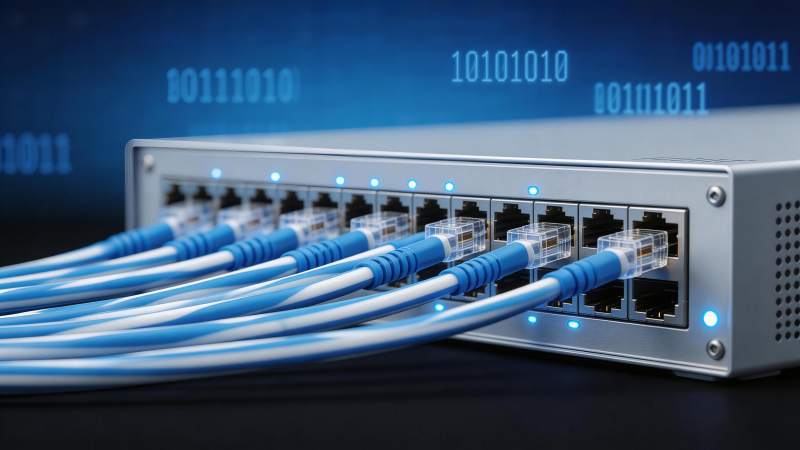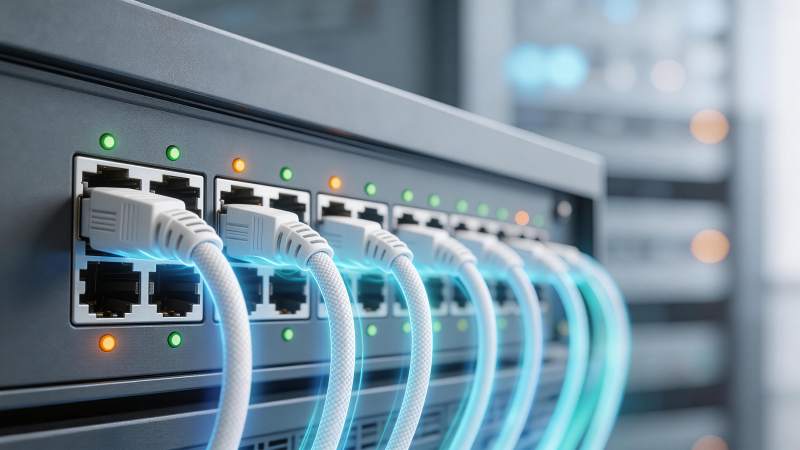 蓝色网线接入交换机端口特写