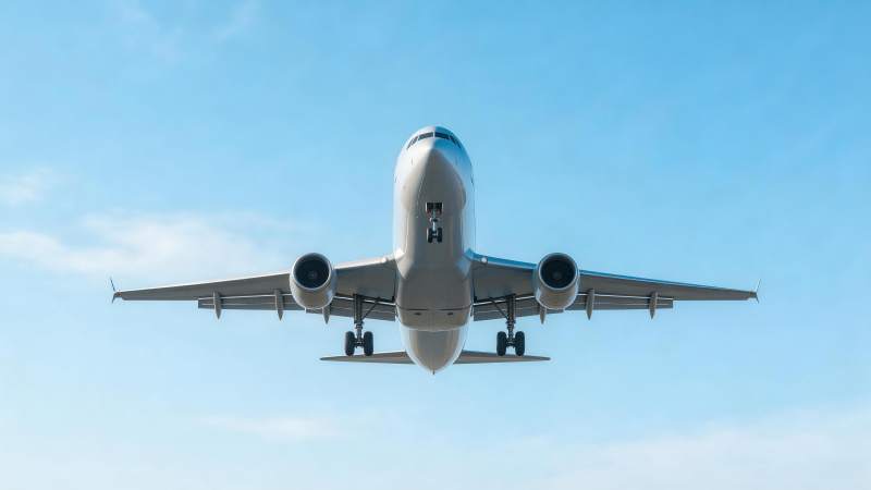 客机从正下方视角飞行于蓝天中