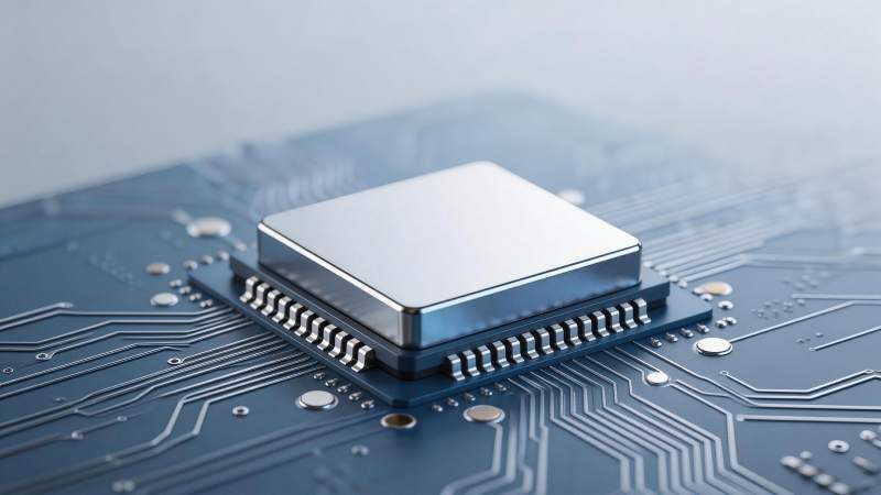 蓝色电路板上的方形金属芯片特写