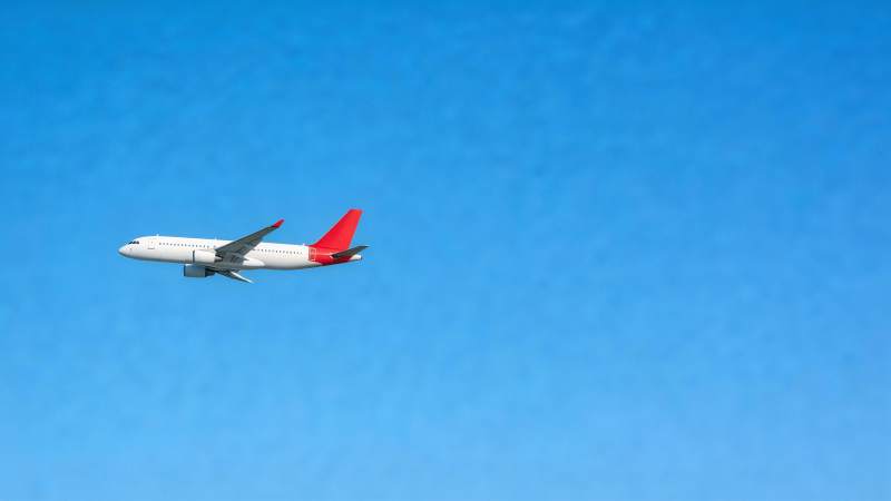 白色客机红尾翼蓝天飞行中
