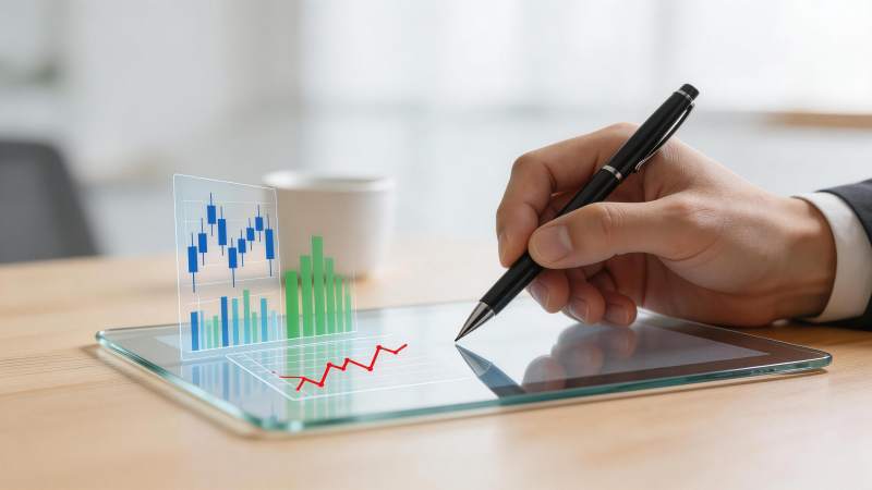 手持钢笔分析平板上三维金融数据图表
