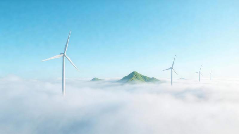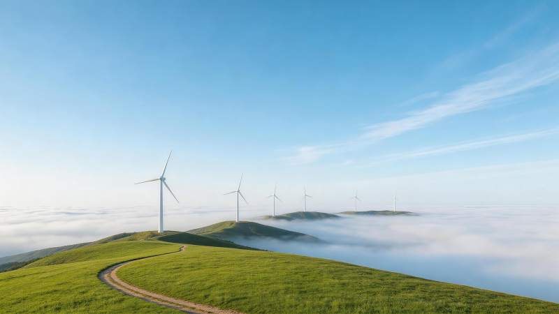 绿色山丘上风力发电机群矗立云海之上