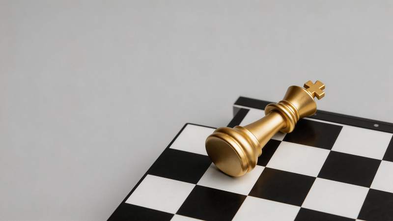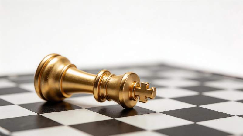 金色国际象棋王棋子倒伏在棋盘格上